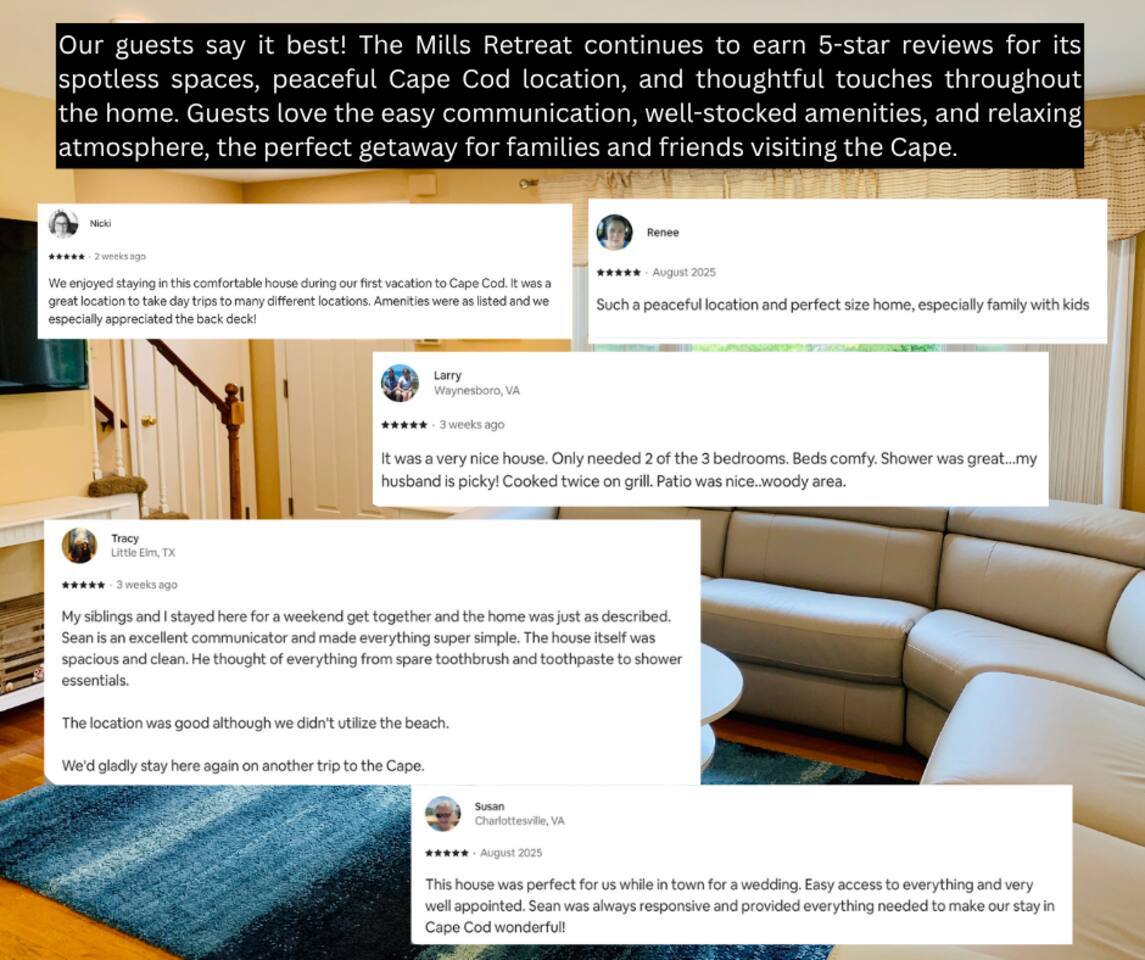 We’re excited to welcome you to The Mills Retreat our Cape Cod getaway! Guests enjoy full access to the entire home, including all bedrooms, bathrooms, the fully equipped kitchen, spacious living areas, laundry facilities, and the private outdoor deck and yard. The only exception is one small locked supply room in the basement. Whether you’re here for a family vacation, group trip, or seasonal escape, you’ll have everything you need for a comfortable and memorable stay. Make yourself at home and enjoy your retreat!